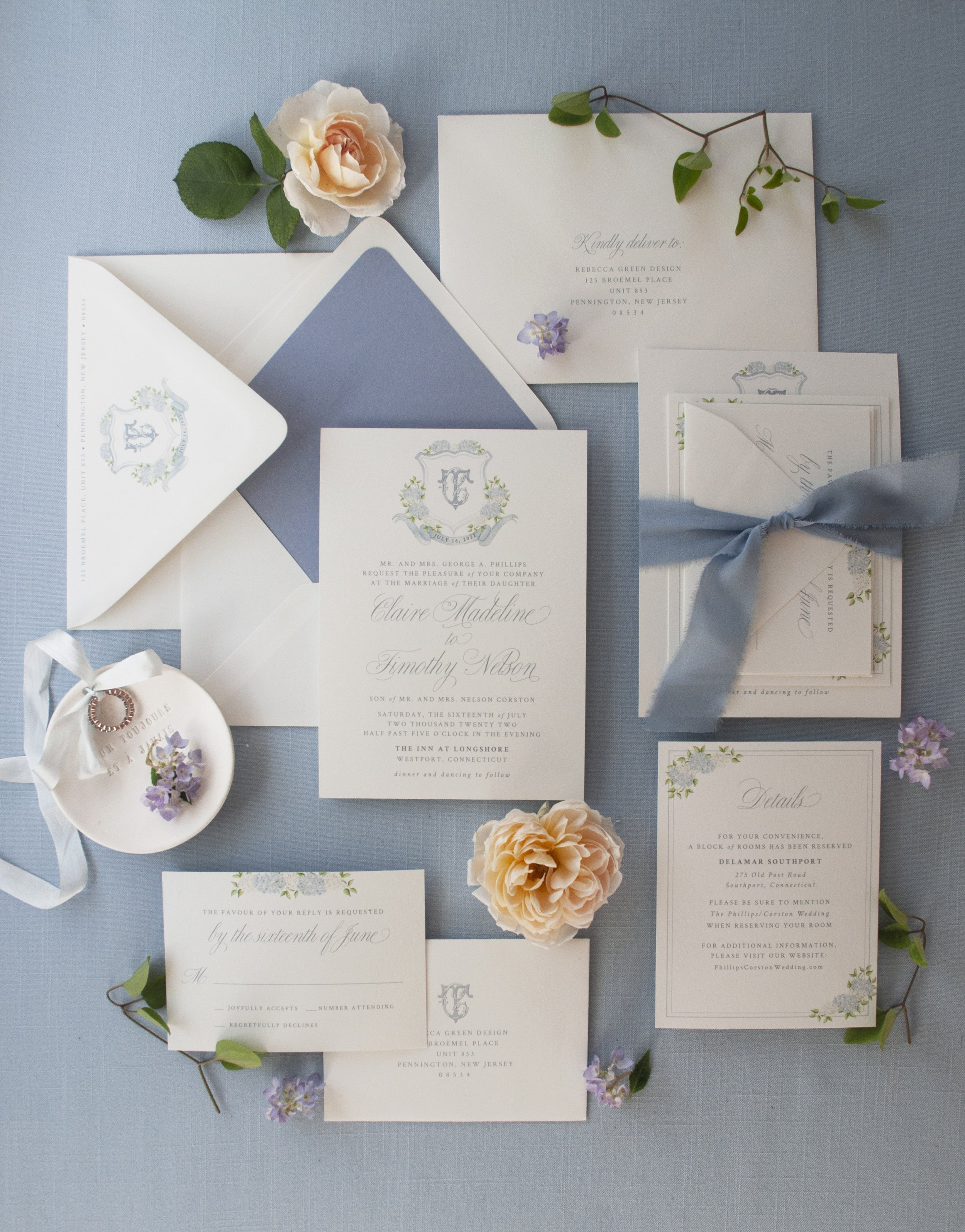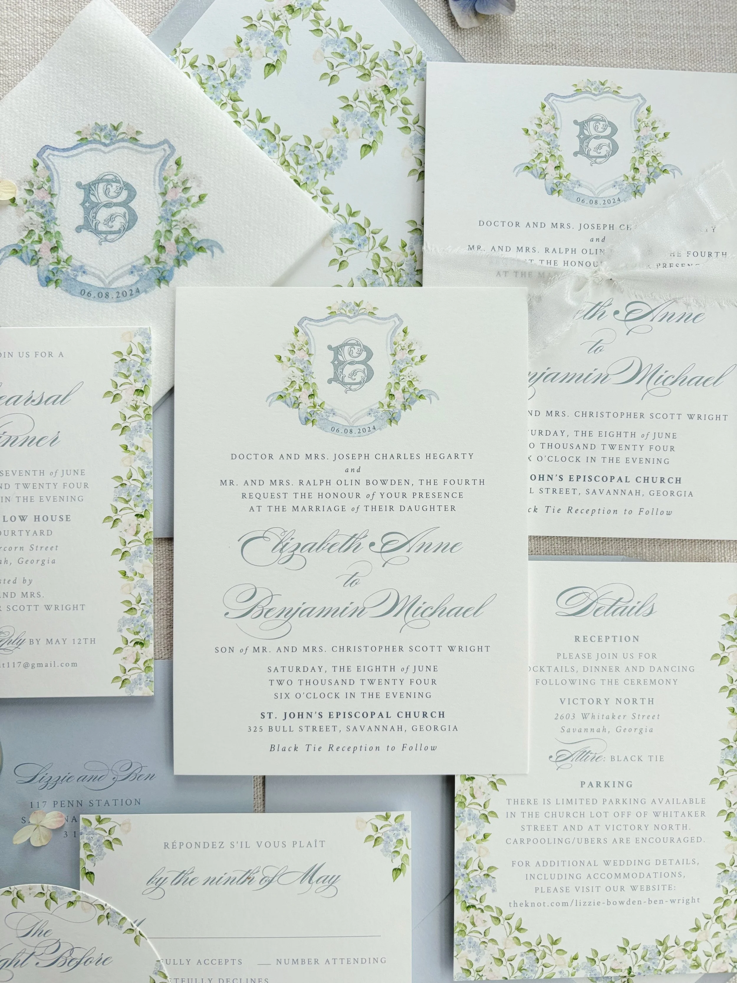 The Abigail Invitation features a gorgeous watercolor crest and coordinating loose watercolor florals. Shown here in French blue ink, and elevated with a .5” hand torn silk ribbon in sage, vellum wrap and coordinating address printing.